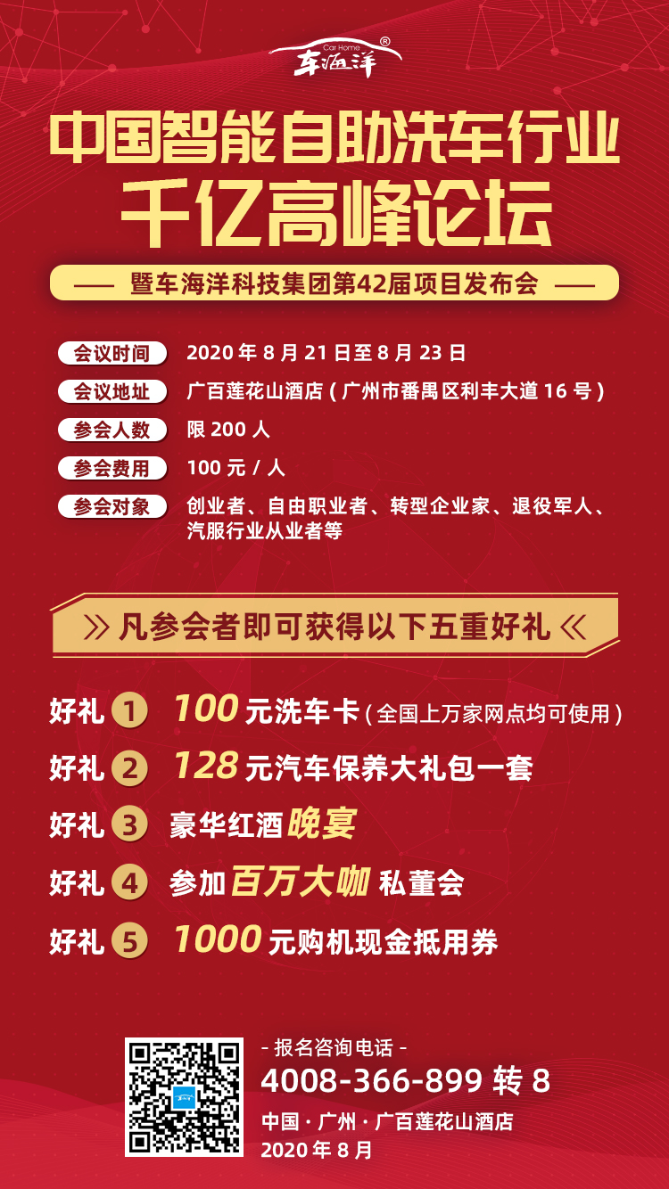 8月29日,中国智能自助洗车行业千亿高峰论坛暨车海洋第42届项目发布会,在广州·广百莲花山休假村隆重召开。有志于加入中国智能自助洗车行业的嘉宾们齐聚广州,一起探讨新时代下智能自助洗车行业的商机和未..