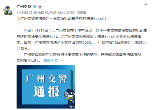 广州交警快速跟进,最终,广州交警通过微博发布通报:对于汉超变造机动车号牌的行为作出罚款5000元、行政拘留15日、驾驶证扣12分的处罚。