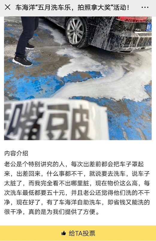 照片故事:老公是个特别讲究的人,每次出差前都会把车子罩起来,出差回来,什么事都不干,就说要去洗车,说车子太脏了,而我完全看不出哪里脏。现在物价这么高,每次洗车最低都要五十元,并且老公还觉得他们洗的不干净,现在好了,有了车海洋自助洗车,既省钱又能洗的很干净,真的是为我们提供了方便。