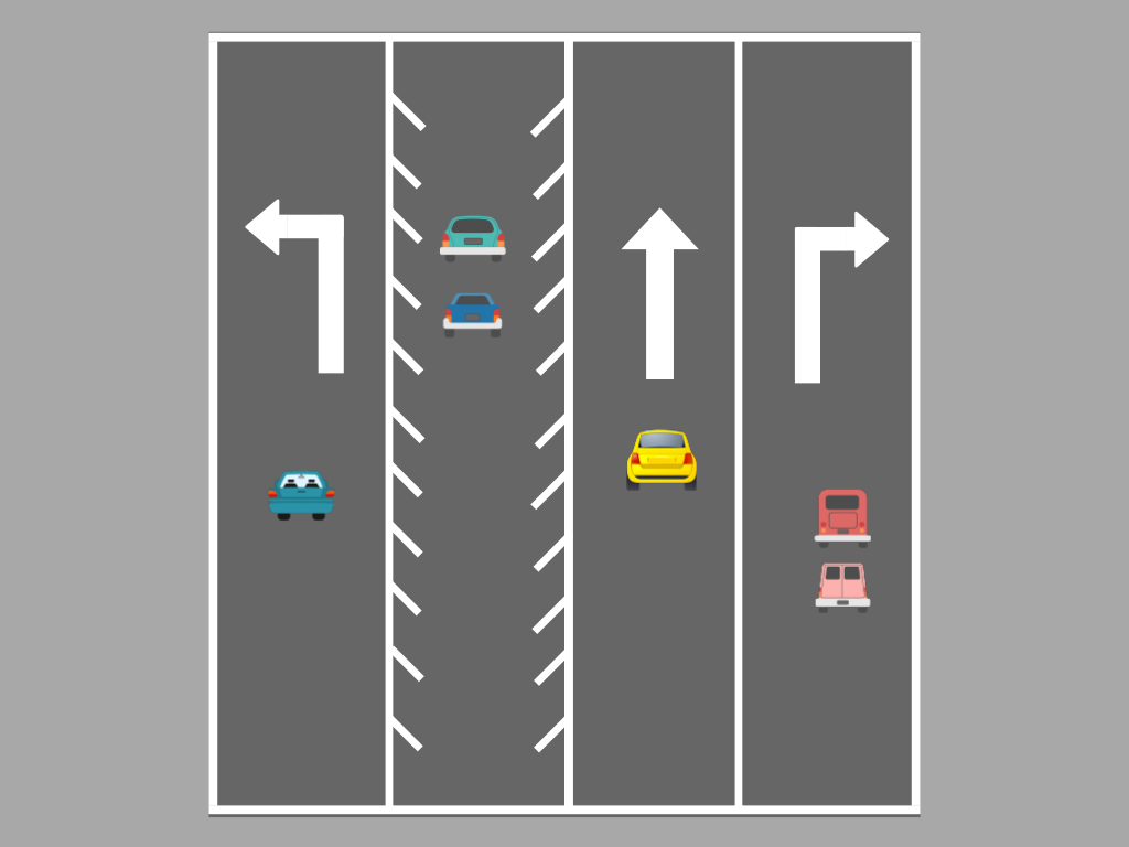 顾名思义,锯齿车道是指车道内侧划了多条斜线,有点像趴下的“非”字,内侧的斜线看起来像一把锯齿,一般设置在城市的交通主干道上,如步行街、商业广场等核心地段,可以更改车道导向。